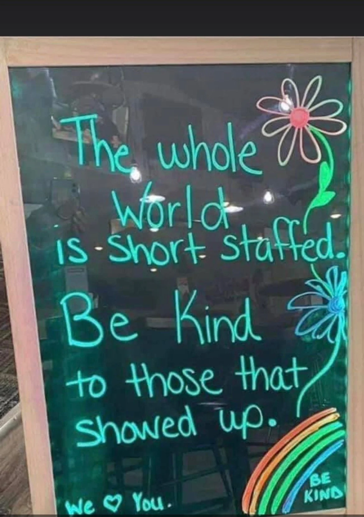 A sign posted outside a restaurant reminding patrons to be kind and appreciative.